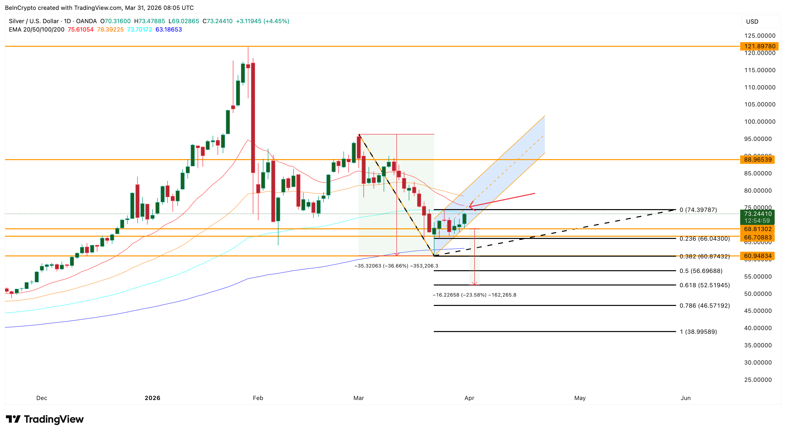 The most critical Silver price level for April is $74. It aligns with a key technical resistance on the daily chart and sits as the first major hurdle above the current price. A daily close above $74 would mark the first structural shift and bring the 20-day Exponential Moving Average (EMA) and 50-day EMA into play. EMA is a trend indicator that gives greater weight to recent price movements. The 20-EMA sits at $75 and the 50-day EMA sits at $78.