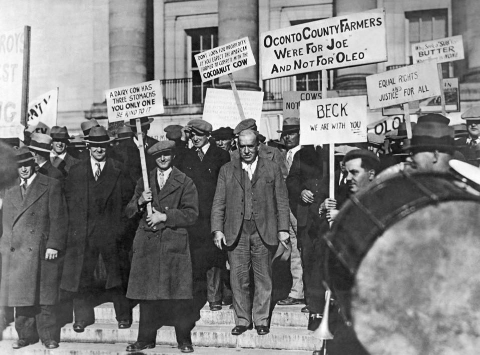 Wisconsin farmers protest the usage and sale of ‘synthetic butter,’ otherwise known as oleo margarine which was made from vegetable or coconut oils, Madison, Wisconsin, circa 1930. (Photo by Underwood Archives/Getty Images)