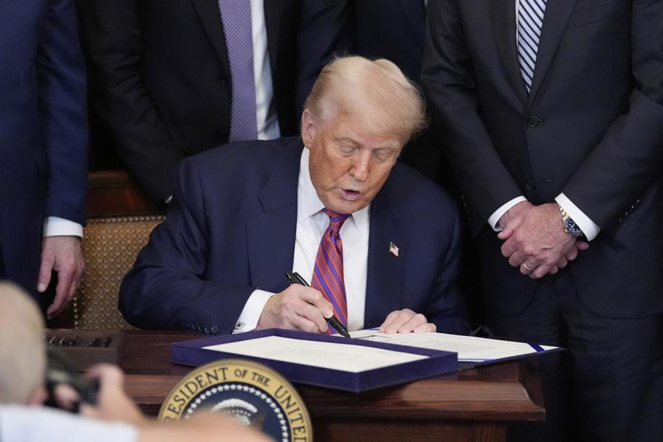 President Donald Trump signs the $GENIUS Act, a bill that regulates stablecoins, a type of cryptocurrency, in the East Room of the White House, Friday, July 18, 2025, in Washington. (AP Photo/Alex Brandon)