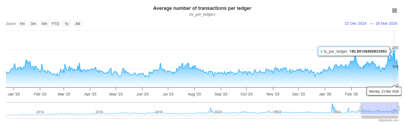 The network has also become more active at the ledger level. The average number of transactions per ledger reached 190 on March 23. This represents a 129% increase from the low of 83 recorded on March 7. Before this jump, the average had stayed close to 90 transactions per ledger each day.