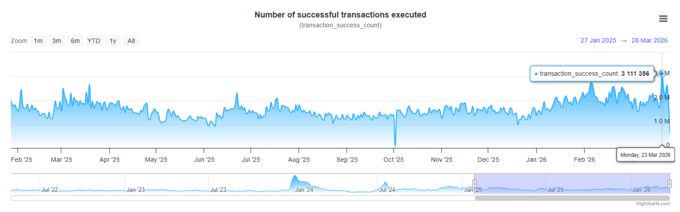 Transaction data also shows an upward trend. On March 23, the number of successful transactions reached 3.111 million, moving past the 3 million mark for the first time in over a year. This represents an upsurge compared to the period between August 2025 and December 2025, when daily transactions stayed around 1.6 million.
