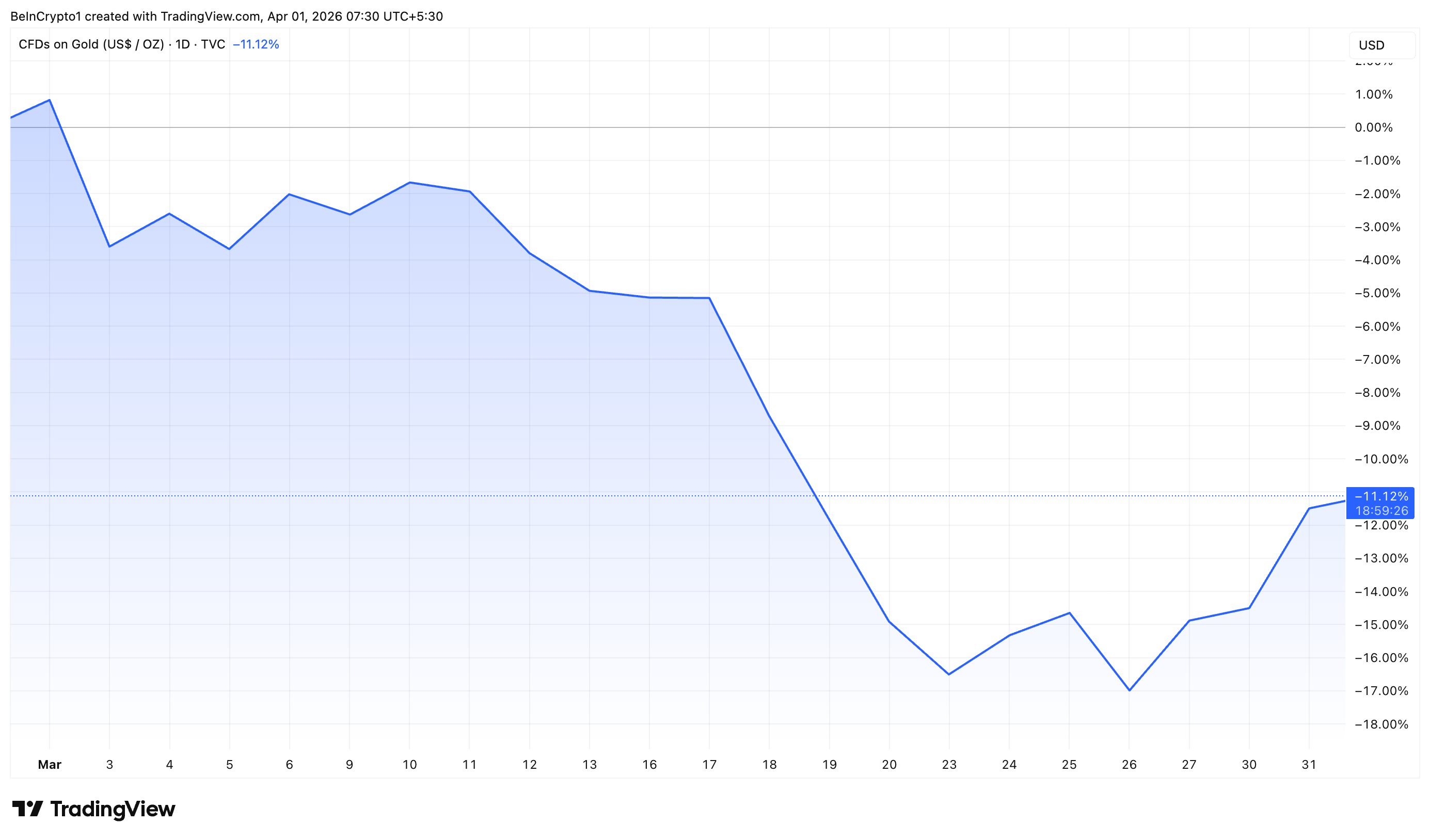 Gold closed March 2026 with its steepest monthly loss in years. The precious metal shed more than 11%, ending an eight-month winning streak.