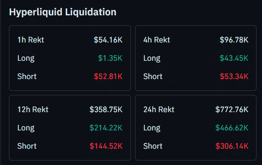 $466,620 were long positions, while $306,140 were short positions, reflecting the ongoing pullback. However, as $HYPE has shown signs of stabilization, short liquidations have surpassed longs in the past 4 hours, with $53,340 for the former and $43,450 for the latter.