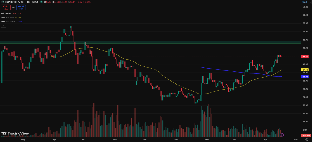 Afterward, $HYPE resumed an uptrend from the higher low at $34.47, targeting an upward push. This time, it had a golden cross as further fuel for the rally. This bullish crossover happened between the 200-day and 50-day moving averages on April 6. The latter crossed over the former, signaling that bearish momentum has exhausted.