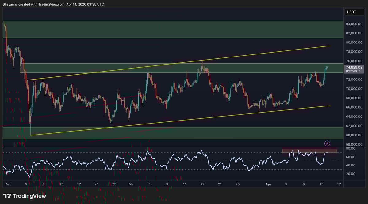 The $74k-$76k area is the most important short-term hurdle to clear. A convincing close above it would open a path toward the $80k–$82k supply zone and would represent a meaningful shift in short-term structure. However, if the price stalls and pulls back from here instead, the channel’s lower boundary near $66k becomes the first support level to defend, with the key $60k zone as the deeper reference below.