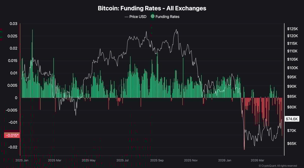 Despite the recent price recovery toward $74.6k, Bitcoin’s funding rates across all exchanges remain deeply negative — currently reading around -0.015 — and have shown no meaningful recovery since the downtrend accelerated in February. The chart tells a stark story, which is that after over a year of predominantly positive funding throughout the 2025 bull market, the shift to persistent negative territory has been both sharp and sustained. The red bars have been dominating virtually every reading across the past two months.