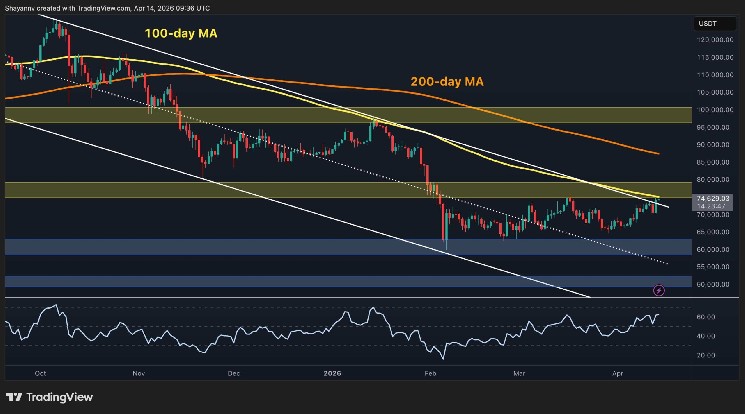 For the second time in the past couple of months, $BTC is pressing directly into the $75k–$80k resistance band on the daily chart. This zone has rejected the previous recovery attempt and coincides with the converging 100-day moving average (~$75k) and the channel’s upper boundary. The fact that the asset is now testing this area with the RSI trending into the 60s gives the current attempt more credibility than prior ones.