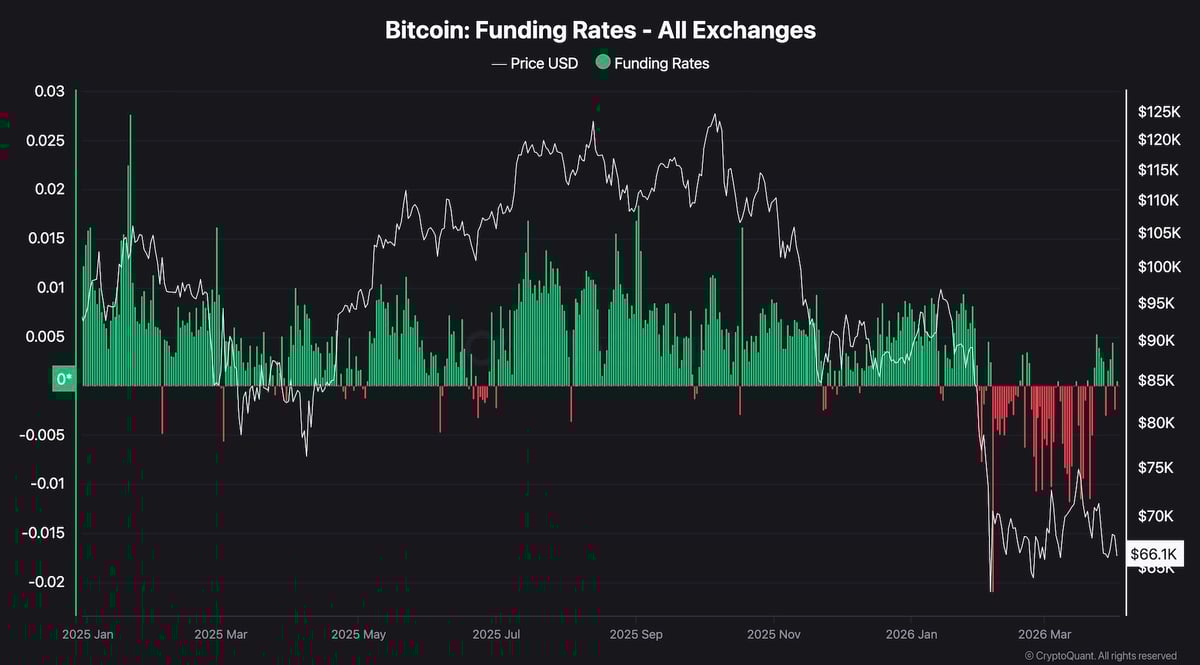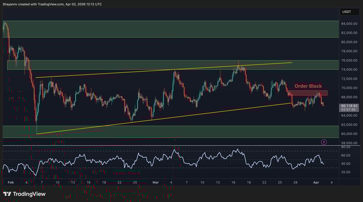The price attempted to push back above the $75k zone in March, but failed decisively. The subsequent lower highs and lows formed signals that sellers are still in control, and are likely to push the asset back below the midline of the channel. This makes the critical support level at $64k vulnerable in the short-term, and a break below it could reopen the downside toward the next key level near $50k.