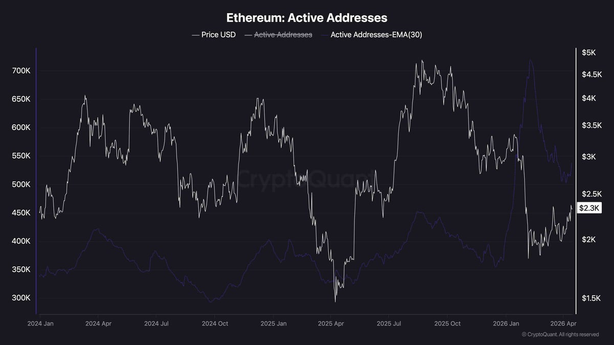The February crash produced a massive spike in Ethereum’s active addresses, with daily activity briefly surging toward levels not seen over the past couple of years.