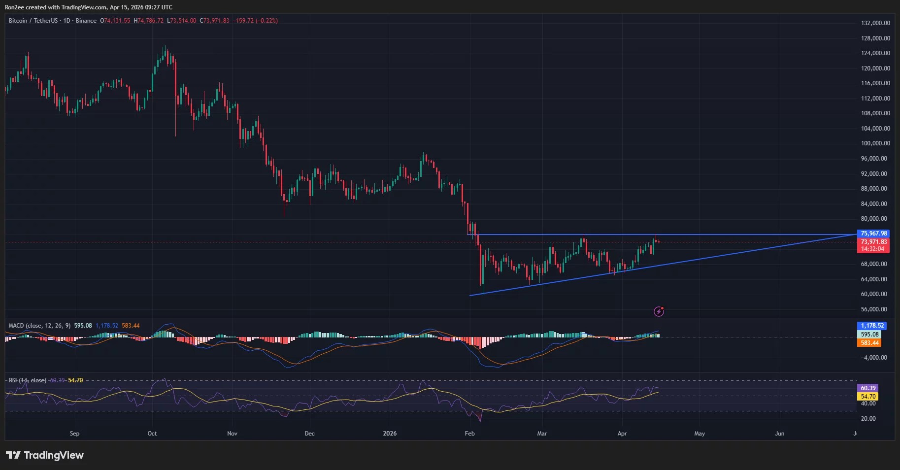 Hence, the next key resistance for Bitcoin lies at $76,000. A break above the trendline could trigger a rally toward the $80,000 mark.