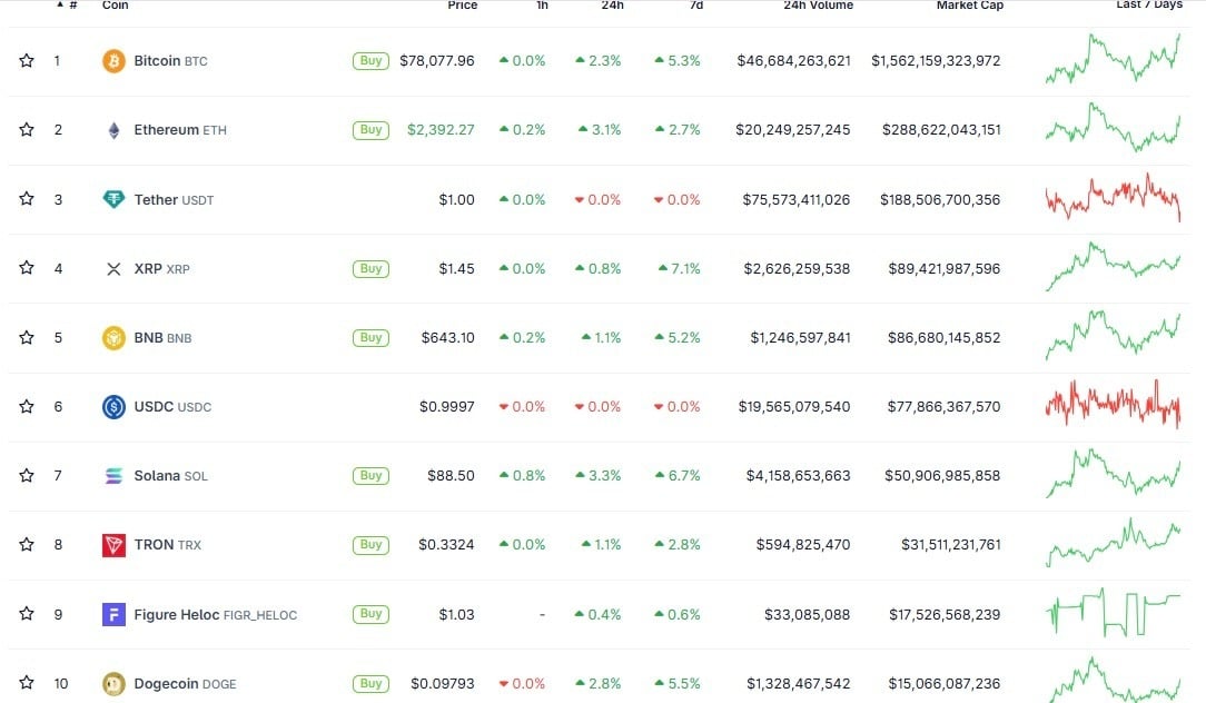 Bitcoin (BTC) price had gained 2.3% over the past 24 hours, thereby trading at approximately $78,077 at the time of reporting. The top ten altcoins that performed best today were Ethereum (ETH), Solana (SOL), and Dogecoin (DOGE). Meanwhile, $XRP price has increased by nearly 1% to trade at $1.45, hence outshining the rest of the top ten altcoins over the past seven days.