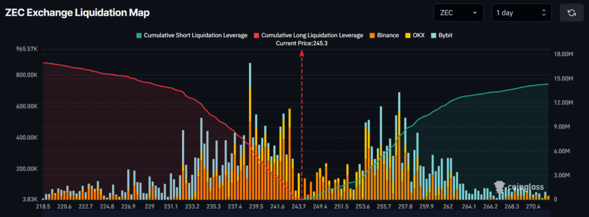 According to the latest data, $238.9 on the lower side and $257.2 on the upper side are major liquidation levels. At these levels, traders have built $5.91 million worth of long leveraged positions and $7.91 million worth of short positions. This suggests that traders are potentially expecting the $ZEC price to decline.