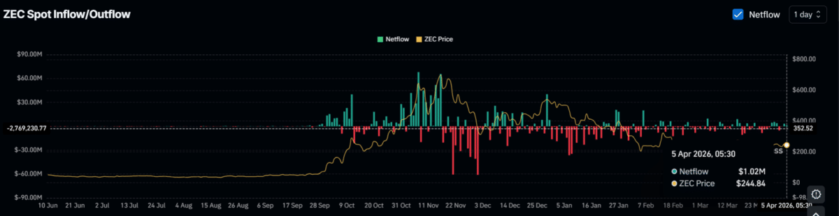 Meanwhile, some long‑term holders appear to be following the same trend, offloading part of their holdings. On the 5th of April 2026, $ZEC’s spot inflow/outflow metric showed $1.02 million worth of $ZEC moving into exchanges, suggesting potential preparation for a sell-off.