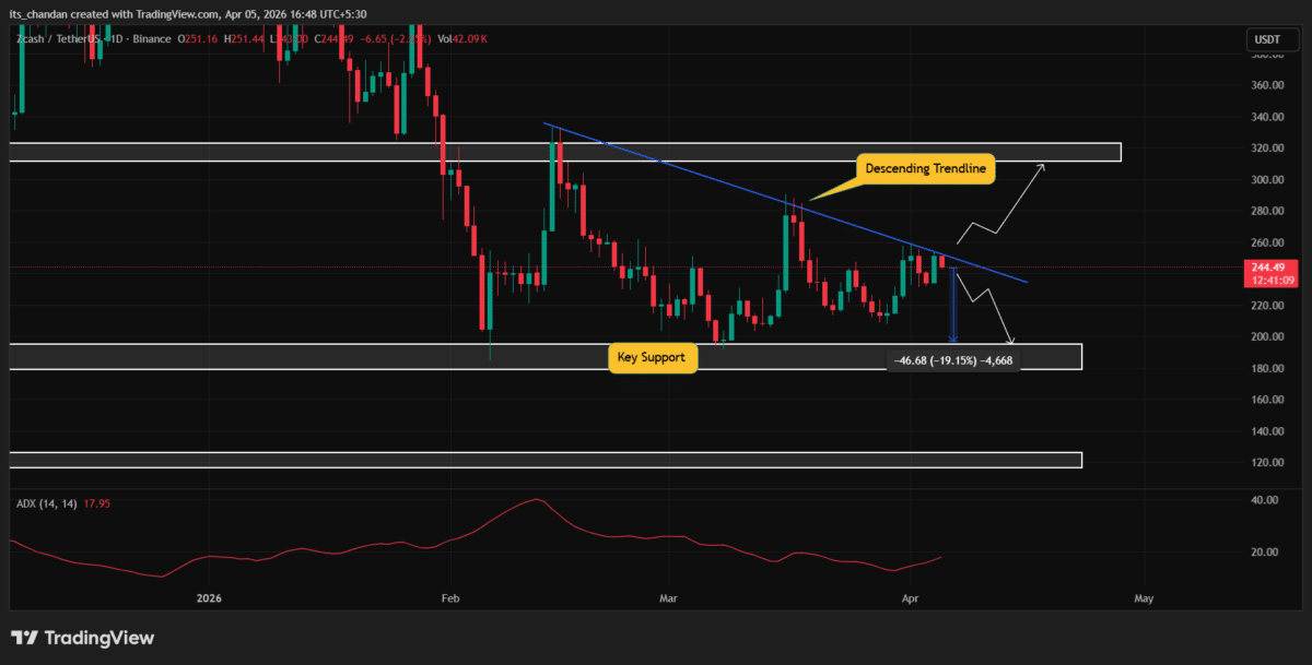 - Zcash prices climbed, but price action suggests $ZEC is at risk of a 20% drop if it fails to breach the descending trendline.