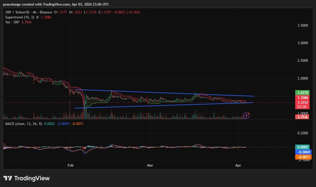 $XRP ($XRP) is trading at $1.3157 on April 3, 2026, down 0.33% on the day and compressing near the apex of a descending wedge pattern that has formed across both the daily and 4H timeframes since February. The Supertrend indicator on the daily chart sits at $1.4894, in red above price, confirming the prevailing bearish regime. Yet the formation itself is a structure that technical analysts typically associate with bullish reversal potential when it emerges at the end of a prolonged downtrend, provided the lower trendline holds.