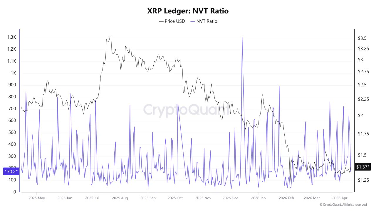 According to the data, $XRP’s NVT has dropped significantly to around 170, a stark contrast to mid-2025 levels, when it spiked above 1,200. That earlier surge coincided with $XRP trading above $3, driven largely by speculative demand rather than sustained network activity.