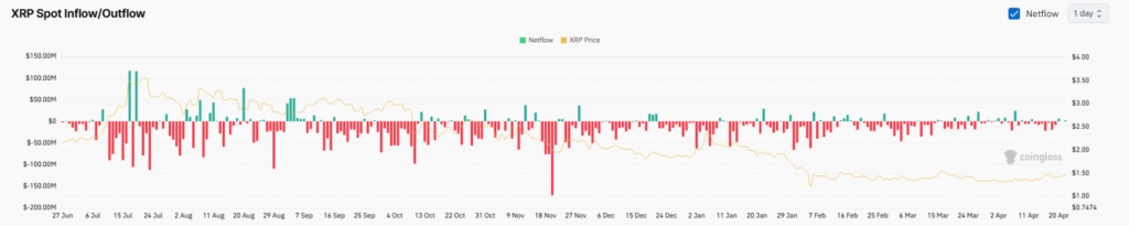 At the same time, on-chain and exchange flow data show that $XRP has seen ongoing net outflows over several months. From late June through early April, outflows consistently exceeded inflows, indicating a persistent imbalance.