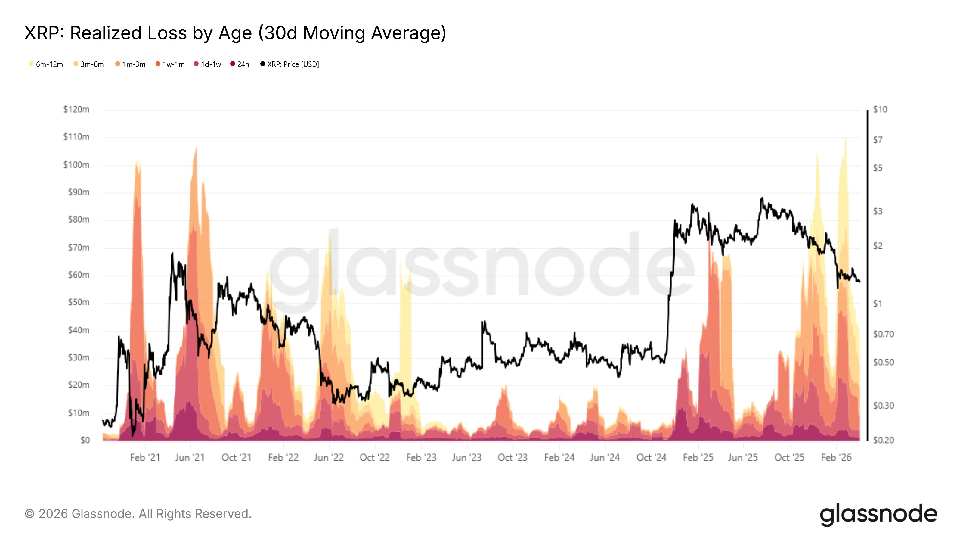• More than half of $XRP’s supply is underwater, with daily realized losses reaching up to $110 million.
