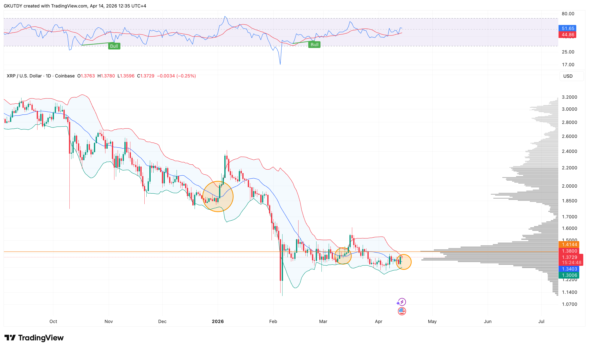 - Bull case: Consolidation above the upper band at $1.40, opening the path toward a test of the $2 level.