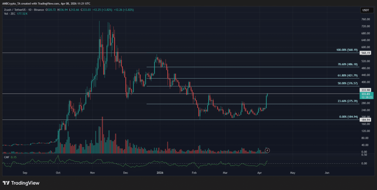 Zcash’s price action strengthened as momentum aligned with rising activity. First, $ZEC rebounded from the $184 base and broke above $275, reclaiming the 23.6% level and signaling a trend reversal.